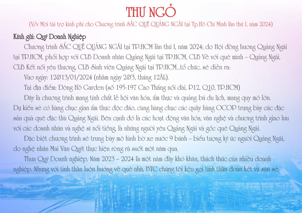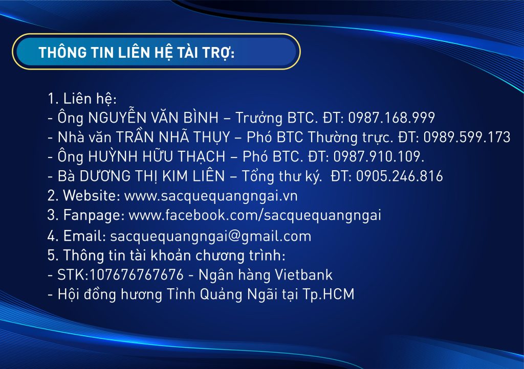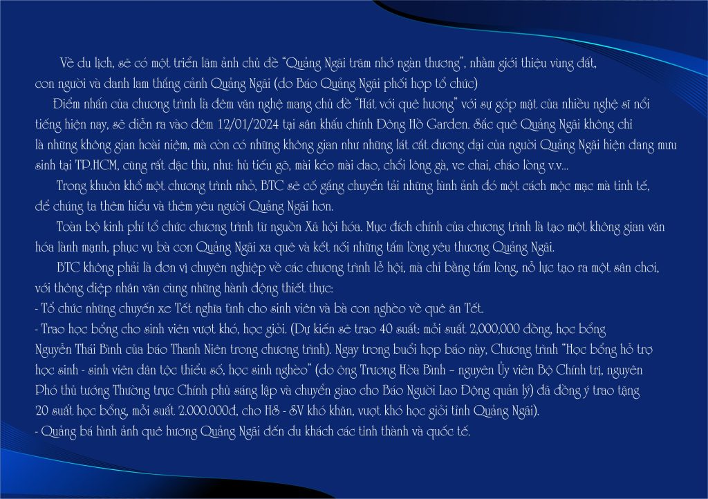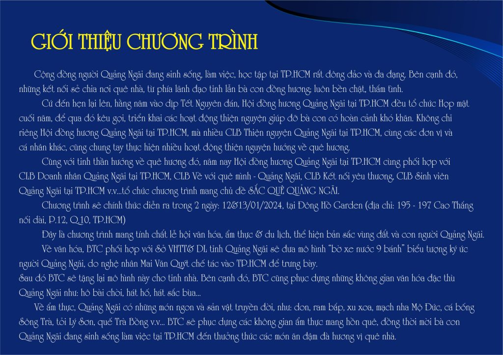 Cũng với tinh thần hướng về quê hương đó, năm nay Hội đồng hương Quảng Ngãi tại TP.HCM cùng phối hợp với CLB Doanh nhân Quảng Ngãi tại TP.HCM, CLB Về với quê mình – Quảng Ngãi, CLB Kết nối yêu thương, CLB Sinh viên Quảng Ngãi tại TP.HCM v.v… tổ chức chương trình mang chủ đề SẮC QUÊ QUẢNG NGÃI.
